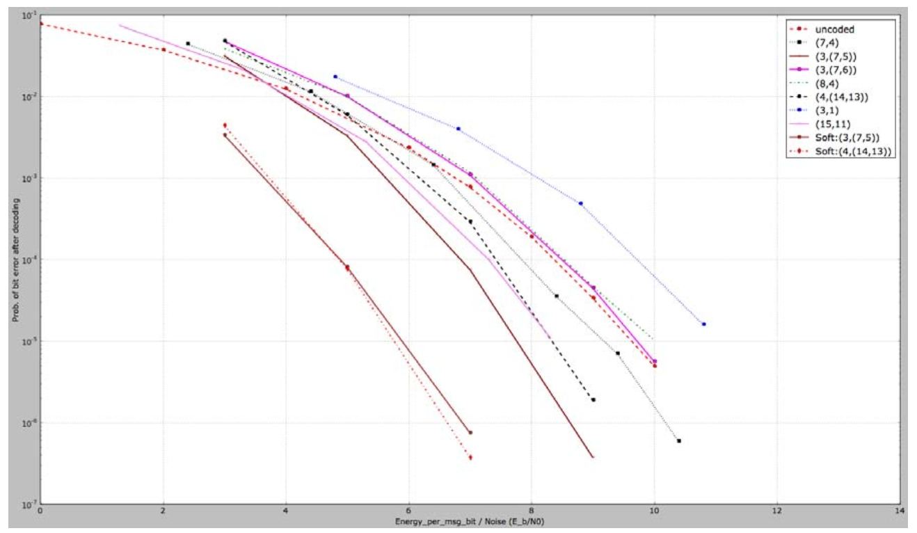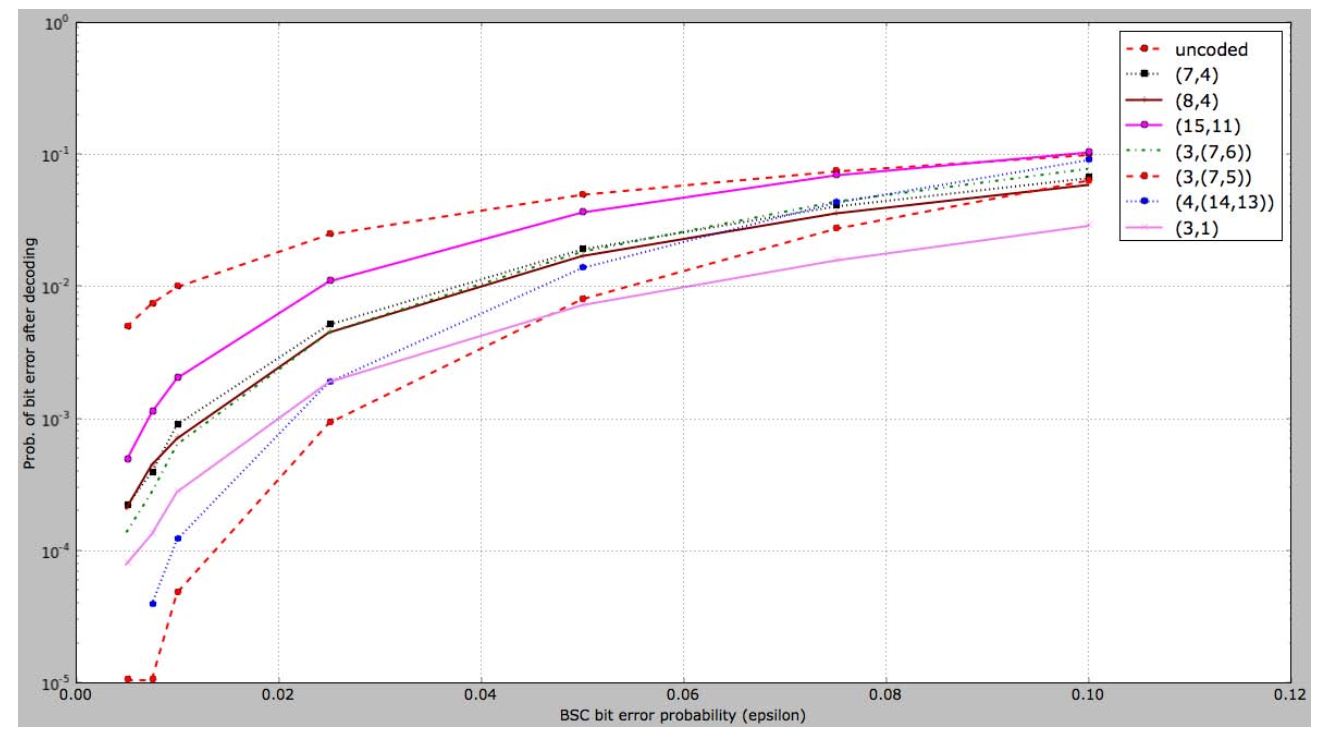 图中显示,码率为1/3的二维奇偶监督码在高ε时表现得最为稳健,而两个1/2码率的卷积码在其它误码率下表现很好。图中同样可以看出,(7,4)和(15,11)汉明码要劣于其它编码。