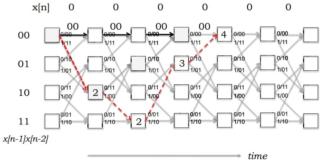 3.每一状态删除其余到达路径,保留最小度量的路径(称为幸存路径),该路径对应于错误最少的路径。
