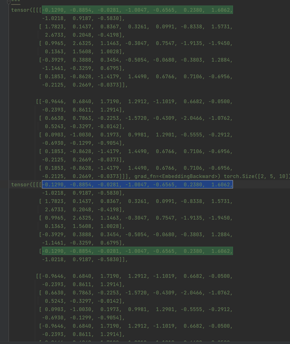 [[-0.9646, 0.6840, 1.7190, 1.2912, -1.1019, 0.6682, -0.0500, -0.2393, 0.8611, 1.2914], [ 0.6630, 0.7863, -0.2253, -1.5720, -0.4309, -2.0466, -1.0762, 0.5243, -0.3297, -0.0142], [ 0.0903, -1.0030, 0.1973, 0.9981, 1.2901, -0.5555, -0.2912, -0.6930, -0.1299, -0.9054], [ 0.1853, -0.8628, -1.4179, 1.4490, 0.6766, 0.7106, -0.6956, -0.2125, 0.2669, -0.0373], [ 0.1853, -0.8628, -1.4179, 1.4490, 0.6766, 0.7106, -0.6956, -0.2125, 0.2669, -0.0373]]], grad_fn=<EmbeddingBackward>) torch.Size([2, 5, 10]) tensor([[[-0.1290, -0.8854, -0.0281, -1.0047, -0.6565, 0.2380, 1.6062, -1.0218, 0.9187, -0.5830], [ 1.7823, 0.1437, 0.8367, 0.3261, 0.0991, -0.8338, 1.5731, 2.6733, 0.2048, -0.4198], [ 0.9965, 2.6325, 1.1463, -0.3047, 0.7547, -1.9135, -1.9450, 0.1363, 1.5608, 1.0028], [-0.3929, 0.3888, 0.3454, -0.5054, -0.0680, -0.3803, 1.2884, -1.1461, -0.3259, 0.6795], [-0.1290, -0.8854, -0.0281, -1.0047, -0.6565, 0.2380, 1.6062, -1.0218, 0.9187, -0.5830]],