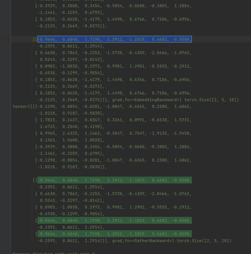 [[-0.9646, 0.6840, 1.7190, 1.2912, -1.1019, 0.6682, -0.0500, -0.2393, 0.8611, 1.2914], [ 0.6630, 0.7863, -0.2253, -1.5720, -0.4309, -2.0466, -1.0762, 0.5243, -0.3297, -0.0142], [ 0.0903, -1.0030, 0.1973, 0.9981, 1.2901, -0.5555, -0.2912, -0.6930, -0.1299, -0.9054], [-0.9646, 0.6840, 1.7190, 1.2912, -1.1019, 0.6682, -0.0500, -0.2393, 0.8611, 1.2914], [-0.9646, 0.6840, 1.7190, 1.2912, -1.1019, 0.6682, -0.0500, -0.2393, 0.8611, 1.2914]]], grad_fn=<GatherBackward>) torch.Size([2, 5, 10])