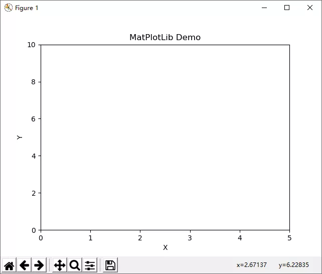 import matplotlib.pyplot as pltfig = plt.figure()ax = fig.add_subplot(111)ax.set(xlim=[0, 5], ylim=[0, 10], title='MatPlotLib Demo',ylabel='Y', xlabel='X')plt.show()