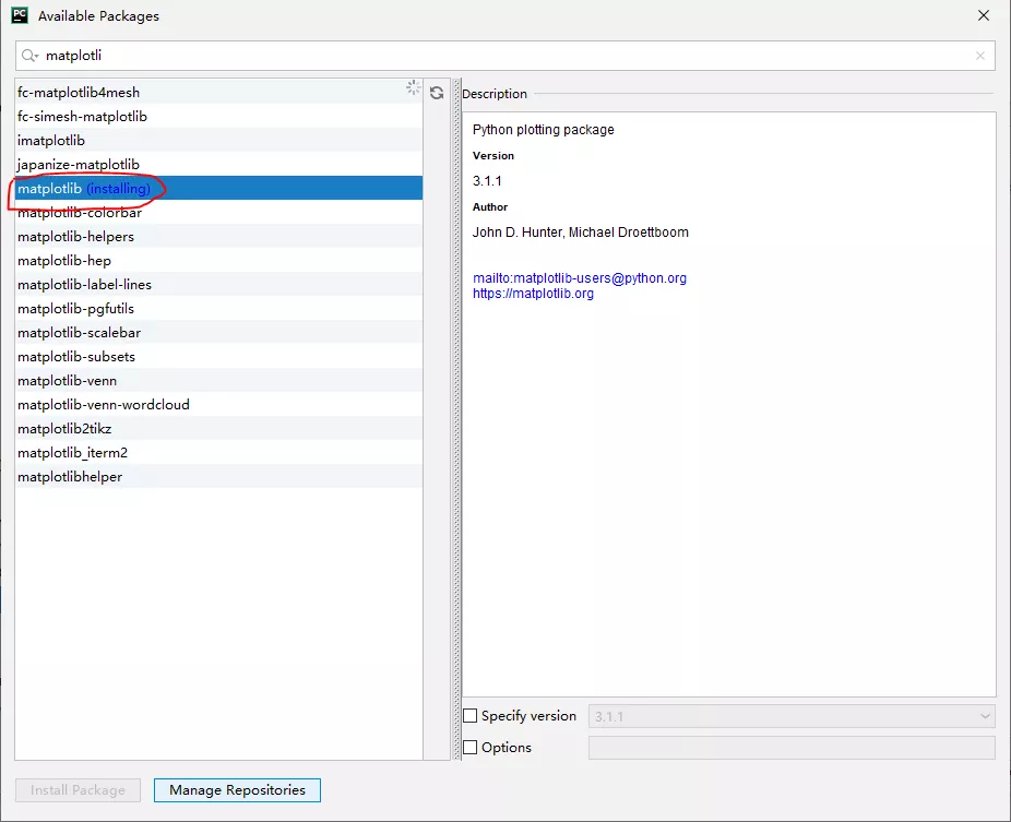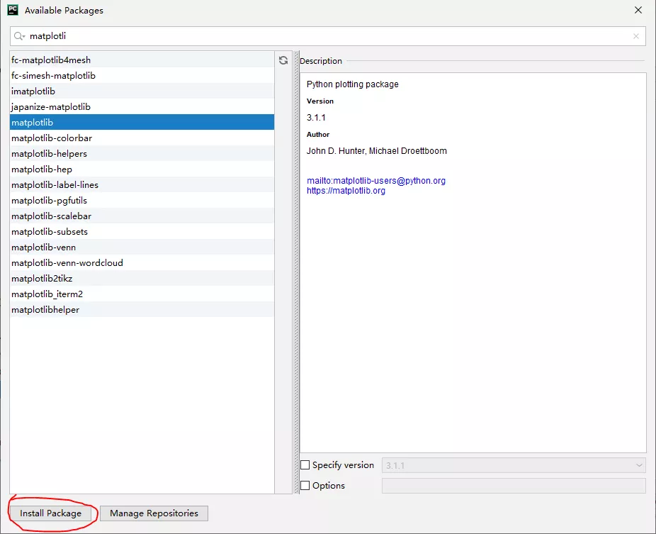 在右侧列表中选择需要安装的功能库,并按下【Install Package】按钮。这时可以在上方的文本框中输入功能库的名称以缩小功能库的表示范围。