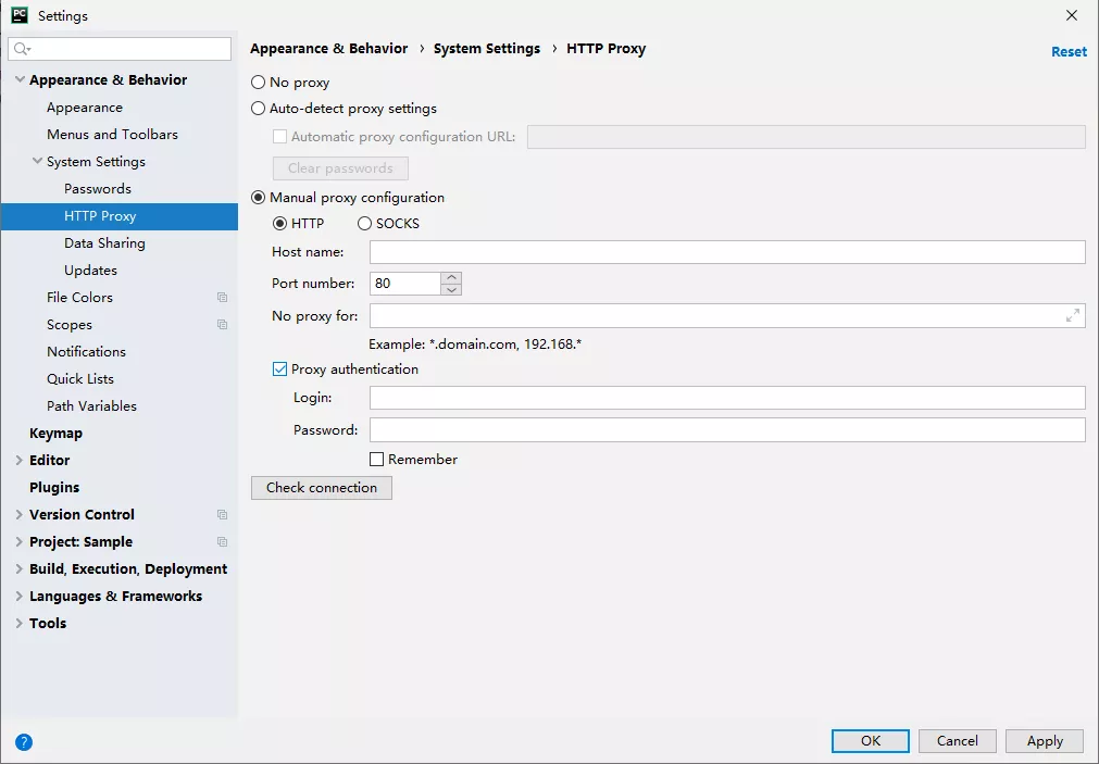 选择【Appearance&Behavior】-【System Settings】-【HTTP Proxy】