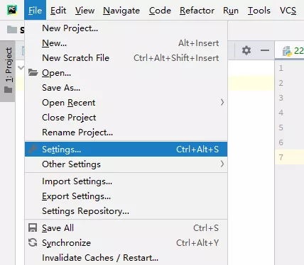 打开【File】-【Settings...】菜单项: