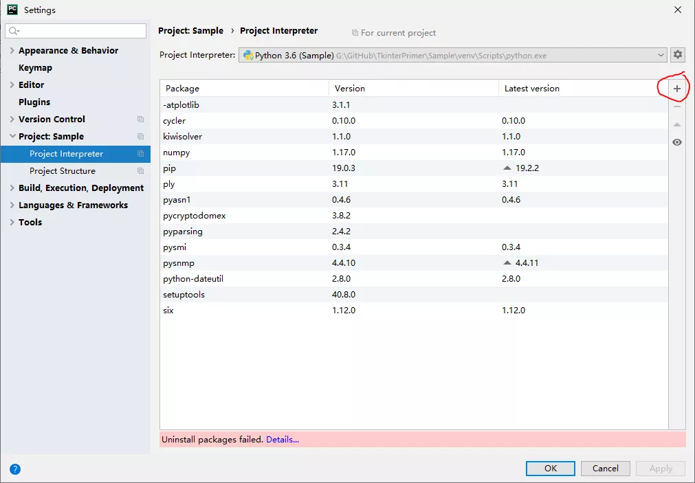 选择【Project】-【Project Interpreter】分类,并按下【+】(下图红圈内)按钮: