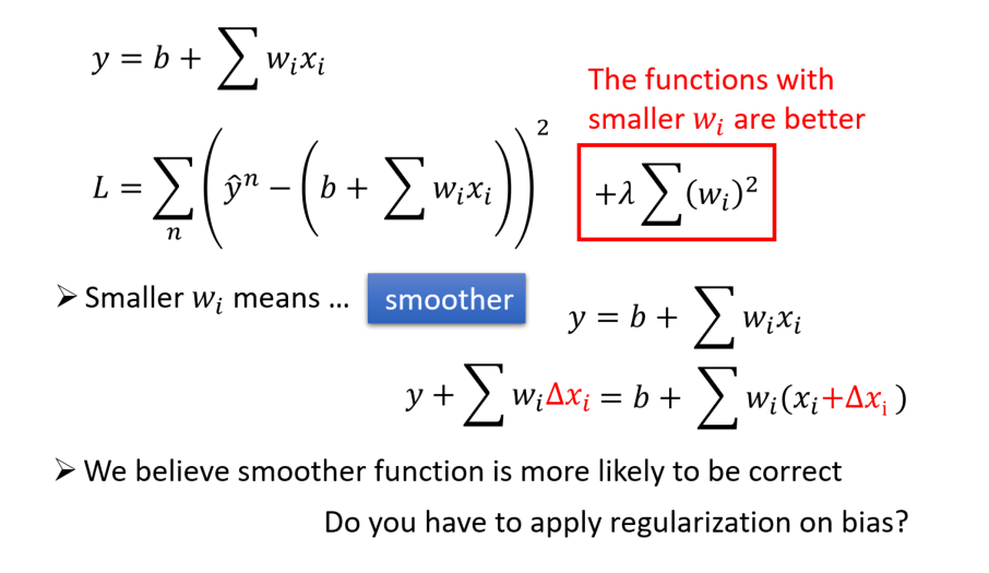 呢?因为这个参数值大小与function的平滑程度是没有关系的,偏置的大小只是把function上下移动而已;针对较平滑的function,由于输出对输入是不敏感的,测试的时候,一些噪声对这个平滑的function的影响就会较小。