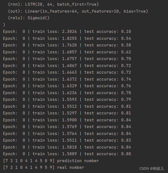 以上就是专注台灯最近收集整理的关于pytorch 使用LSTM进行手写数字识别模型的搭建模型的训练的全部内容,更多相关pytorch内容请搜索靠谱客的其他文章。