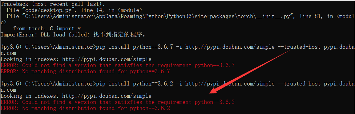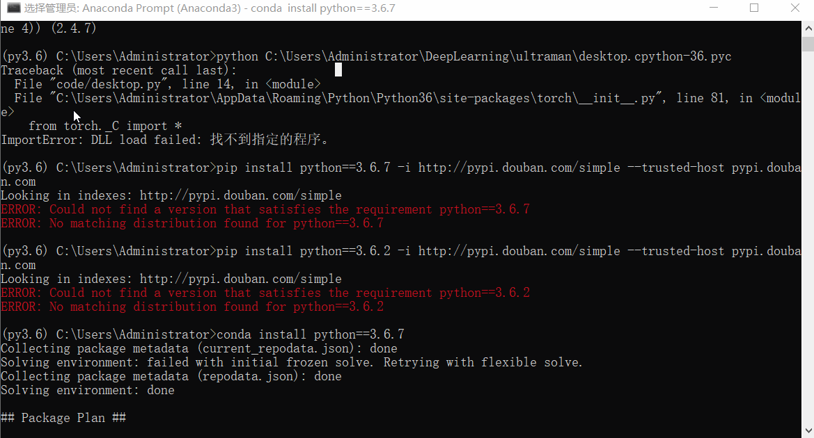 pip升级配置的 python 版本也会报错,用conda install python==3.6.7,如下所示: