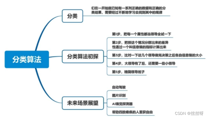 有训练数据集,不断学习规律,然后再测试数据,有监督学习,分类算法核心在于经验不断积累,不断迭代自己的规则,从而得到最好的答案。常见分类算法:C4.5决策树(逐级找领导再剪枝)、朴素贝叶斯、支持向量机SVM、随机森林、逻辑回归……