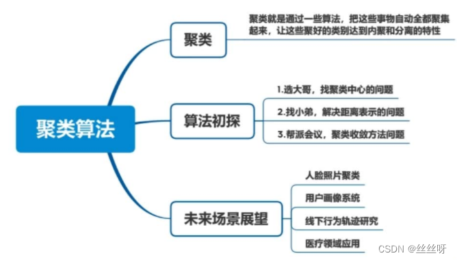 通过算法将事物全部自动聚集起来,让聚好的类别达到内聚(组内)和分离(不同组)特性,最终任何事物的特征属性都可以变成类似距离的东西来计算。使用聚类算法时要尽量把一些异常点剔除掉,或者单独把它们单独聚成一类,否则一些有异常的数据会影响我们聚类算法的最终准确性。