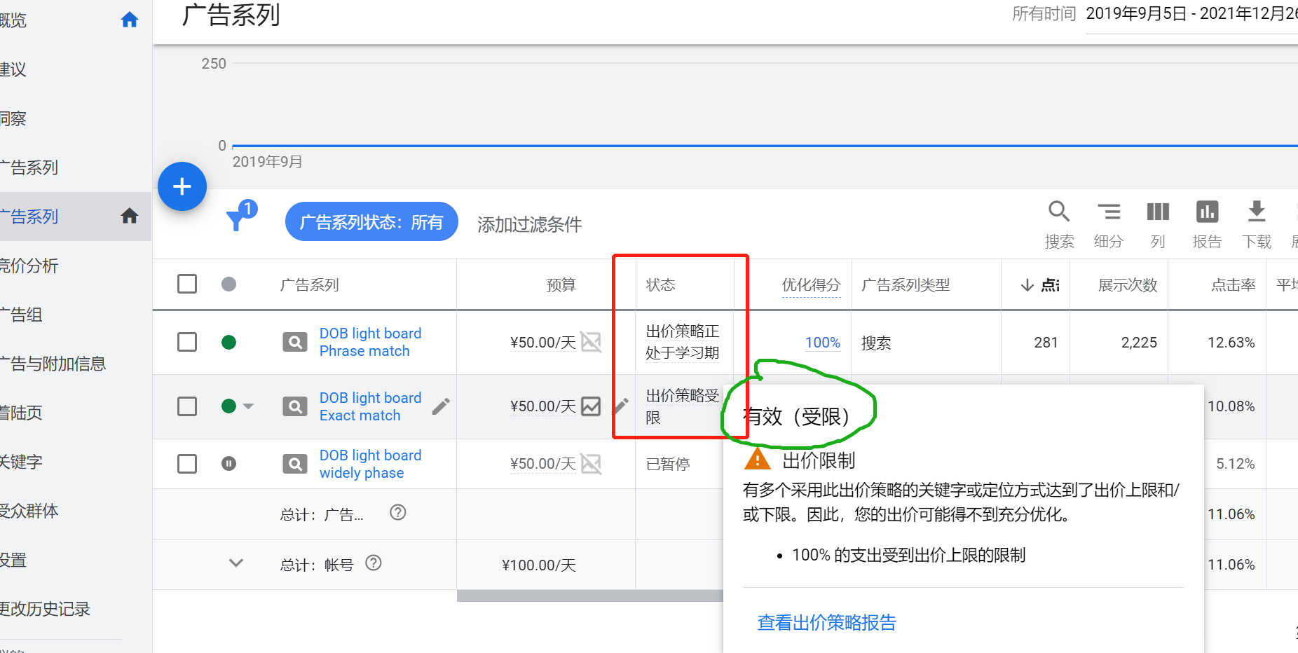 出价策略的定义:有多个采用此出价策略的关键字或定位方式达到了出价上限和/或下限。因此,您的出价可能得不到充分优化。100% 的支出受到出价上限的限制。