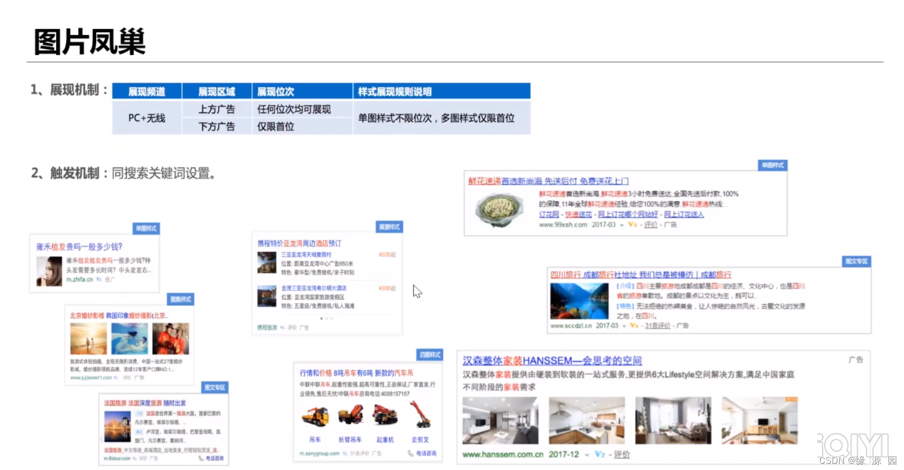 跟搜索关键词的设置是保持一致的。只要词匹配了,图就会展现了。因为每添加一张图,后台是可以设置主题的。主题可以设置产品的名称,图片所附带的主题能够被触发,就可以展现,所以每条创意不是对应一条广告。