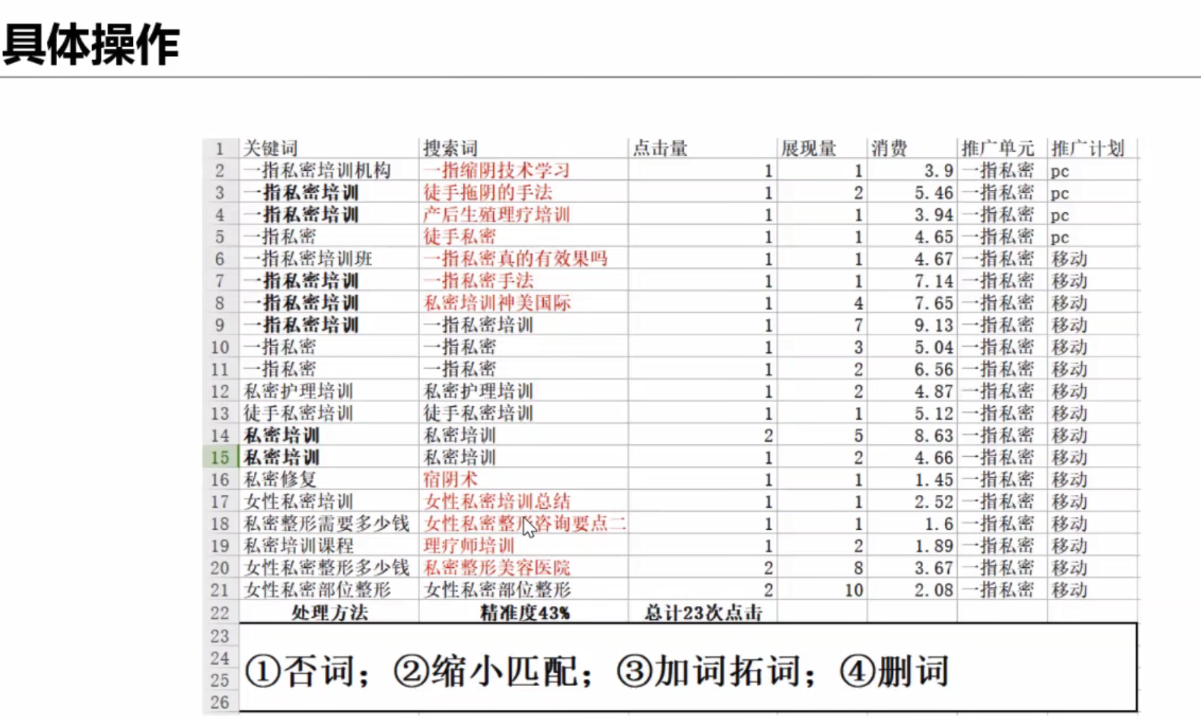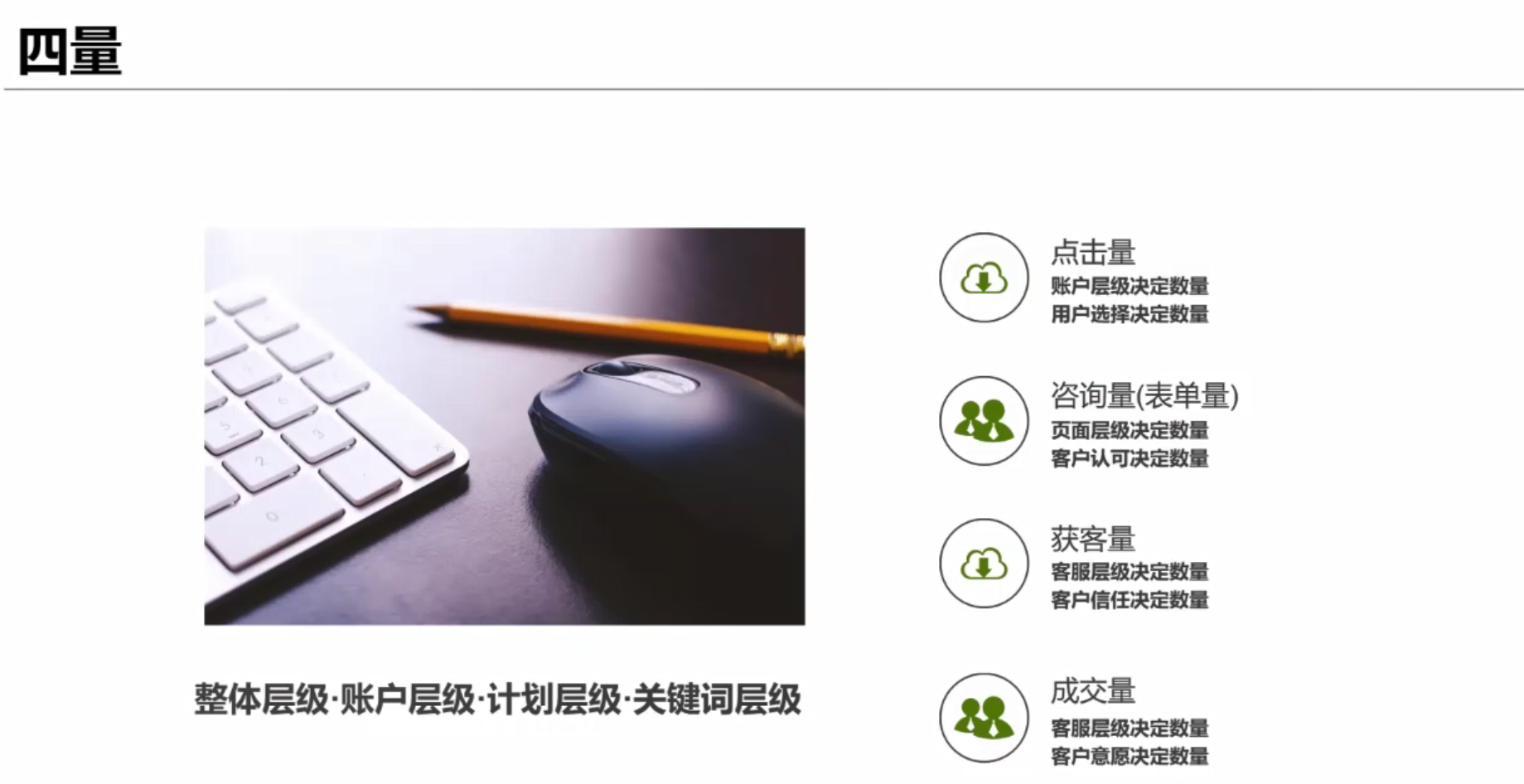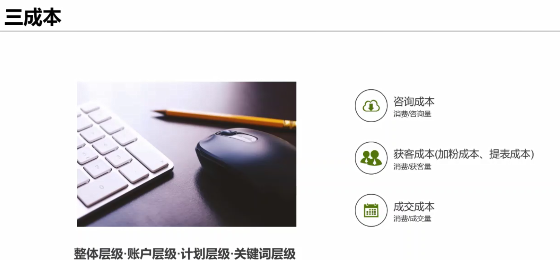获得多少展现目标值出多少钱。获得多少点击目标值出多少钱。获取每个转化目标是多少钱。 各个节点都有一个价值金额出价可以设置的。获得了1000次点击,有500次是不精准的,有水分的。过滤,否词,排除,无效等等。现在虽然获得了500次点击,但是单次点击价值更高,更加精准。