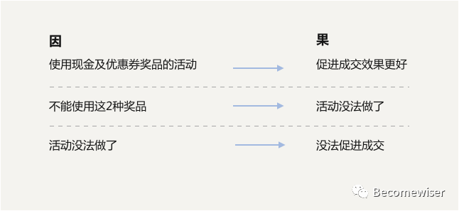 在上述的案例中假设原因和结果都为真,套入第3点做出以下提问:1)使用现金及优惠券奖品,一定会使成交效果更好吗,是否有其他的方式?2)不使用这2种奖品,活动一定不能做吗,是否有其他的奖品?3)活动没法做,一定不能促进成交吗,是否有其他的方式?