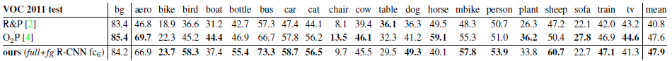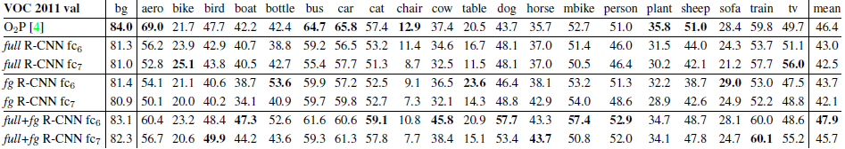 In Table 7 we show the per-category segmentation accuracy on VOC 2011 val for each of our six segmentation methods in addition to the O2P method [4]. These results show which methods are strongest across each of the 20 PASCAL classes, plus the background class.