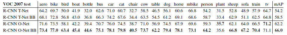 按照PASCAL VOC的最佳实践步骤,我们在VOC2007的数据集上验证了我们所有的设计思想和参数处理,对于在2010-2012数据库中,我们在VOC2012上训练和优化了我们的支持向量机检测器,我们一种方法(带BBox和不带BBox)只提交了一次评估服务器。