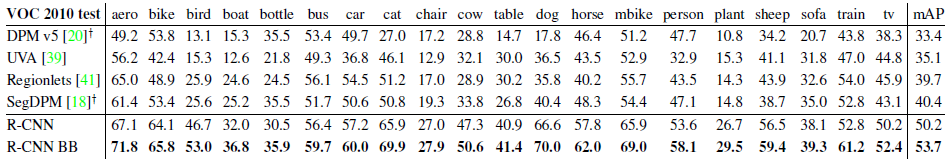 Table 1: Detection average precision (%) on VOC 2010 test. R-CNN is most directly comparable to UVA and Regionlets since all methods use selective search region proposals. Bounding-box regression (BB) is described in Section C. At publication time, SegDPM was the top-performer on the PASCAL VOC leaderboard. yDPM and SegDPM use context rescoring not used by the other methods.