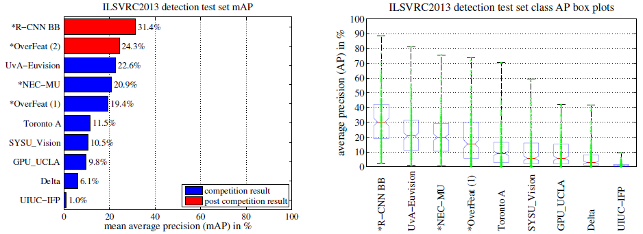 Figure 3: (Left) Mean average precision on the ILSVRC2013 detection test set. Methods preceeded by * use outside training data (images and labels from the ILSVRC classification dataset in all cases). (Right) Box plots for the 200 average precision values per method. A box plot for the post-competition OverFeat result is not shown because per-class APs are not yet available (per-class APs for R-CNN are in Table 8 and also included in the tech report source uploaded to arXiv.org; see R-CNN-ILSVRC2013-APs.txt). The red line marks the median AP, the box bottom and top are the 25th and 75th percentiles. The whiskers extend to the min and max AP of each method. Each AP is plotted as a green dot over the whiskers (best viewed digitally with zoom).