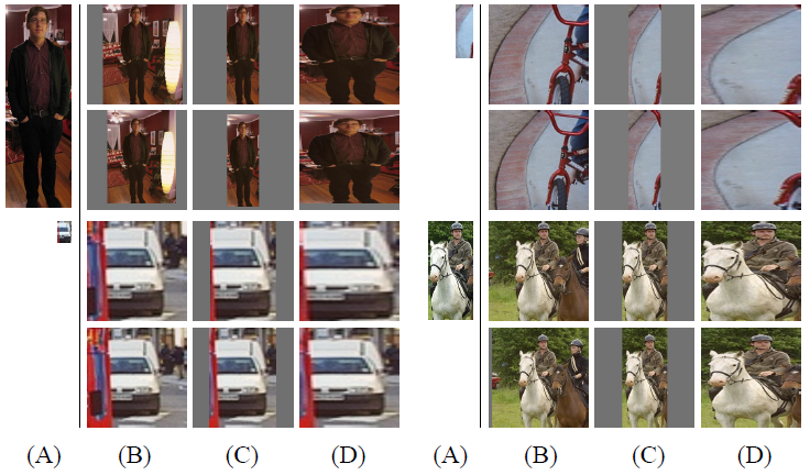 Figure 7: Different object proposal transformations. (A) the original object proposal at its actual scale relative to the transformed CNN inputs; (B) tightest square with context; (C) tightest square without context; (D) warp. Within each column and example proposal, the top row corresponds to p = 0 pixels of context padding while the bottom row has p = 16 pixels of context padding.