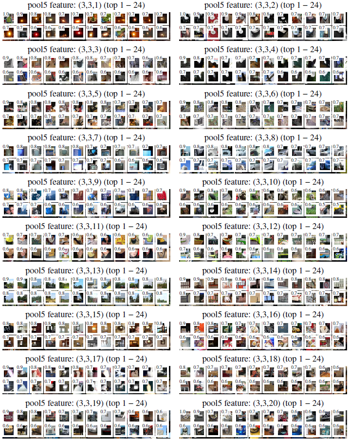 Figure 12: We show the 24 region proposals, out of the approximately 10 million regions in VOC 2007 test, that most strongly activate each of 20 units. Each montage is labeled by the unit’s (y, x, channel) position in the 6[1]6[1]256 dimensional pool5 feature map. Each image region is drawn with an overlay of the unit’s receptive field in white. The activation value (which we normalize by dividing by the max activation value over all units in a channel) is shown in the receptive field’s upper-left corner. Best viewed digitally with zoom.