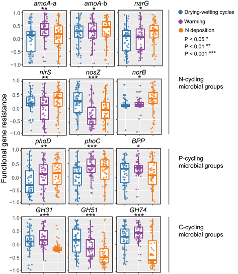 Fig. 4 Effects of warming, drying-wetting cycles and N deposition on the resistance of genes involved in C, N, and P cycling.