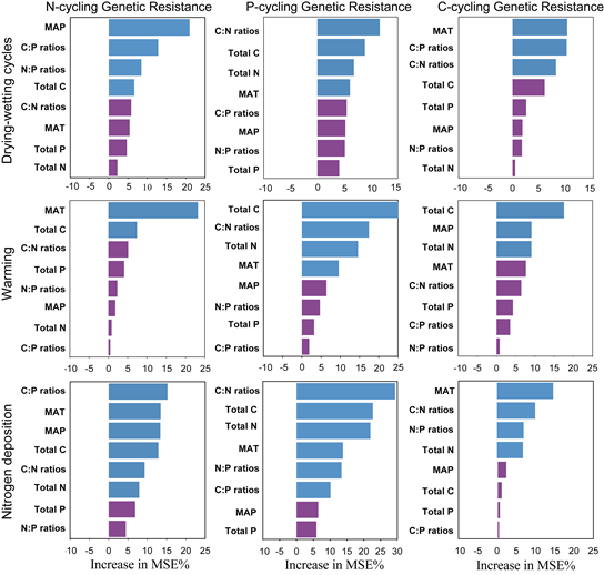 Fig. 5 Random forest mean predictor importance of MAT and MAP and soil C:N:P stoichiometry as the drivers of C, N, and P cycling genetic resistance to warming, drying-wetting cycles and N deposition. Blue fill indicates significance level at p < 0.05.