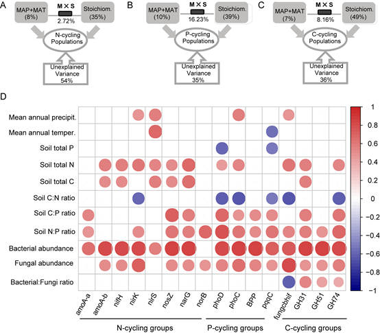 Fig. 3 The individual and combined explanatory power of MAT and MAP and soil C:N:P stoichiometry on functional populations (A-C); The relationships of individual gene abundance with MAT, MAP, soil C:N:P stoichiometry, and bacterial and fungal abundance (D). The blue and red color show respectively a negative and positive relationships between two variables.