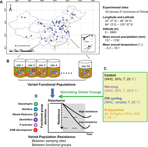 短暂的干扰能加快土壤碳氮循环过程。虽然土壤微生物能通过影响有机磷的矿化及无机磷的溶解来影响土壤磷循环,但与碳氮循环相比,在环境变化下对土壤磷循环相关微生物类群的研究较少。此外,大量研究表明,微生物群落在不同地理尺上存在空间变异性。为了进一步明确年平均温度(MAT)、年平均降水(MAP)及土壤C/N/P化学计量特性对土壤功能潜力的影响,本研究收集了来自于我国21个省份54个点的苜蓿土壤样品。之后,土壤样品在模拟全球变化条件下(对照、增温、氮沉降和干湿交替循环)室内培养30天(图1)。本研究主要通过定量PCR技术测定了与碳、氮和磷循环相关的微生物类群丰度,并进一步计算了各功能类群对全球变化的抵抗力。通过本章研究可以进一步明确土壤化学计量平衡对于维持土壤功能稳定性的重要性。