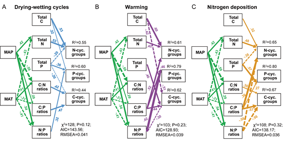 Fig. 6 Structural equation modeling describing the effects of MAT and MAP and soil C:N:P stoichiometry on the population resistance of C, N, and P cycling microbial-groups to drying-wetting cycles, warming, and N deposition.