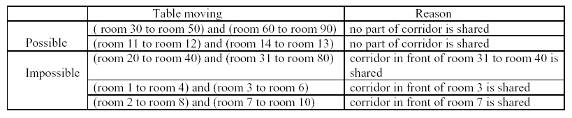 For each room, at most one table will be either moved in or moved out. Now, the manager seeks out a method to minimize the time to move all the tables. Your job is to write a program to solve the manager’s problem.