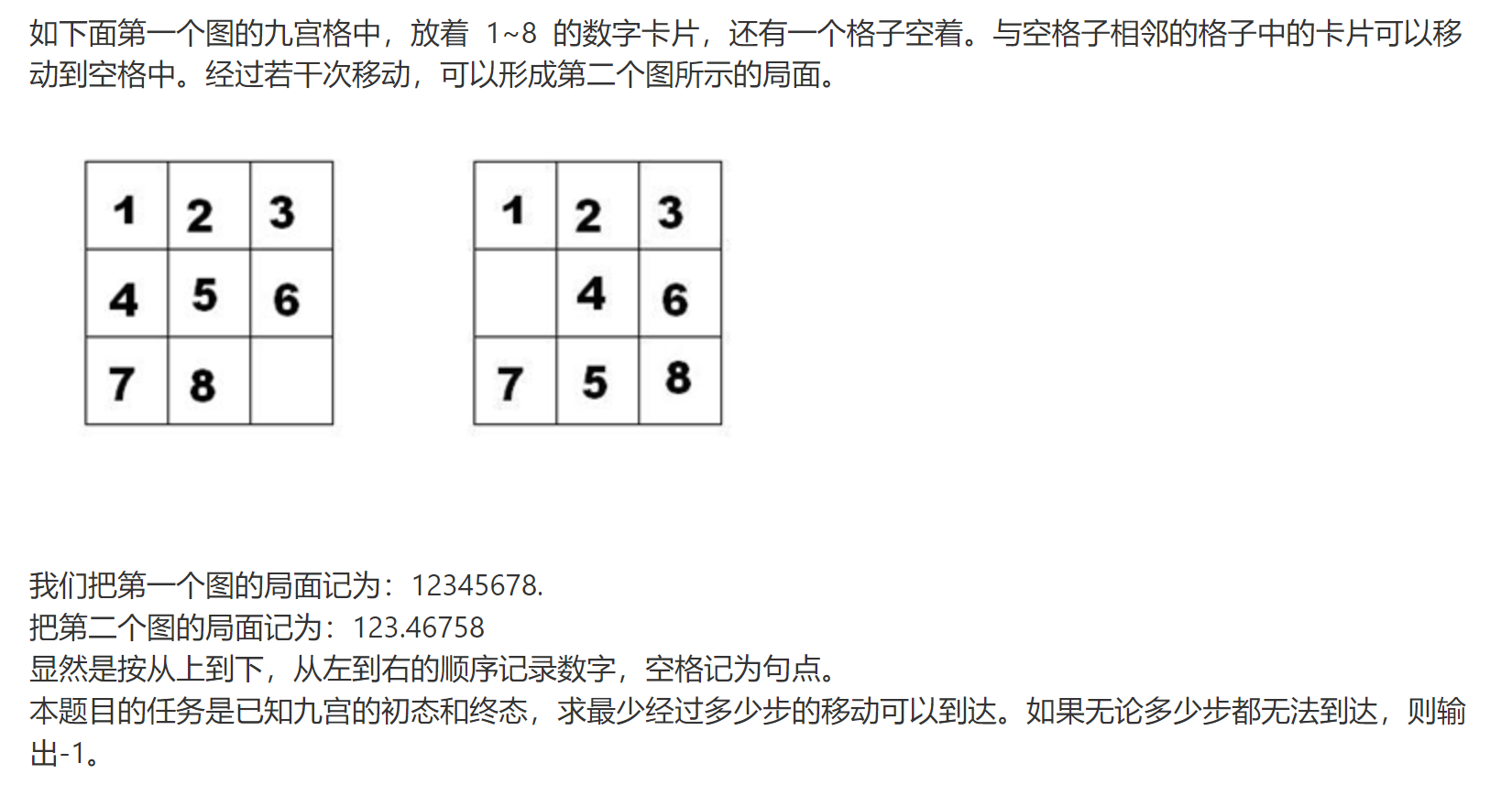 以上就是跳跃哈密瓜最近收集整理的关于蓝桥杯试题--九宫重排的全部内容,更多相关蓝桥杯试题--九宫重排内容请搜索靠谱客的其他文章。