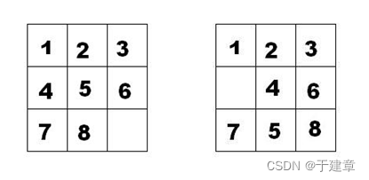 如下面第一个图的九宫格中,放着 1~8 的数字卡片,还有一个格子空着。与空格子相邻的格子中的卡片可以移动到空格中。经过若干次移动,可以形成第二个图所示的局面。