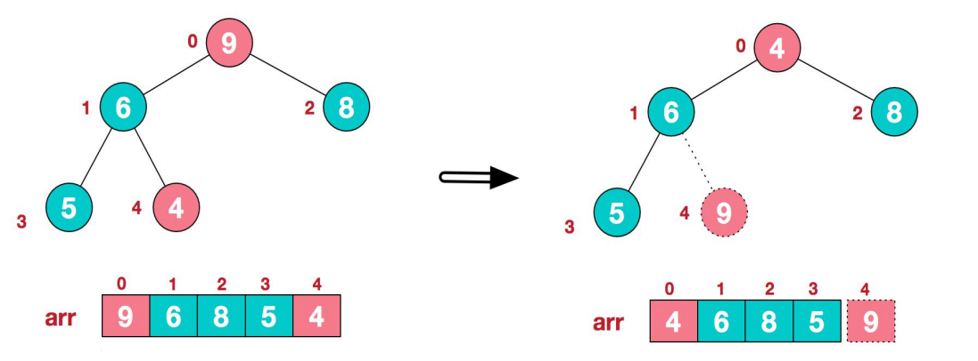 1)将堆顶元素9和末尾元素4进行交换