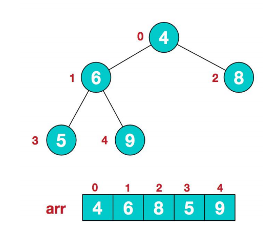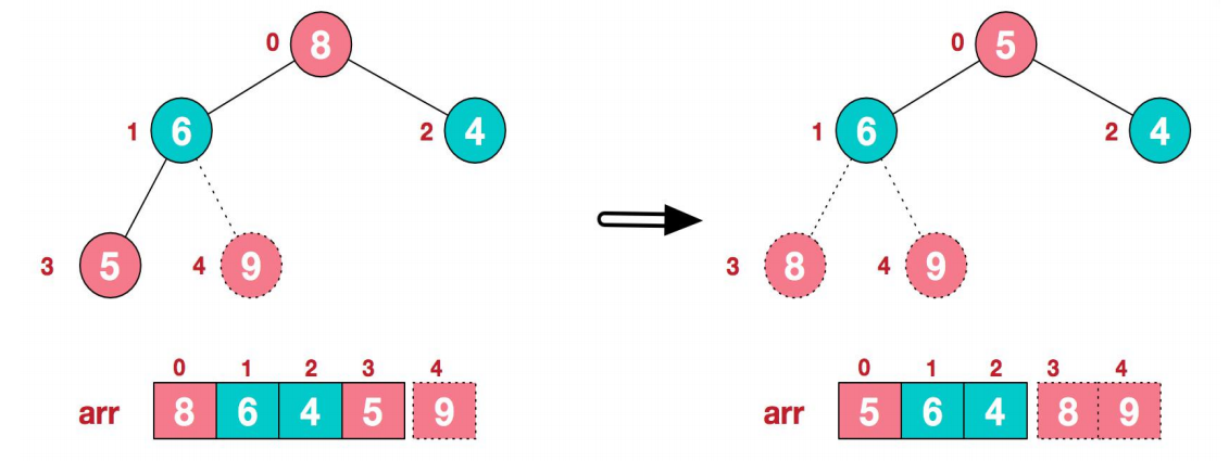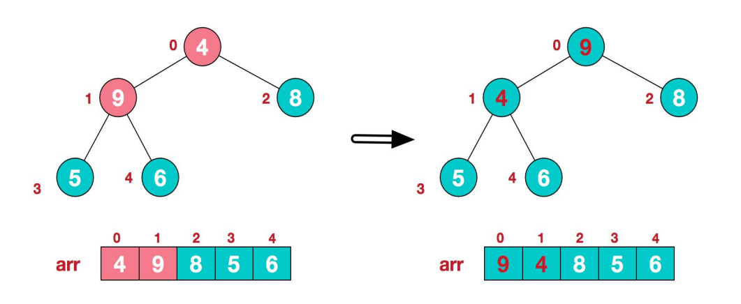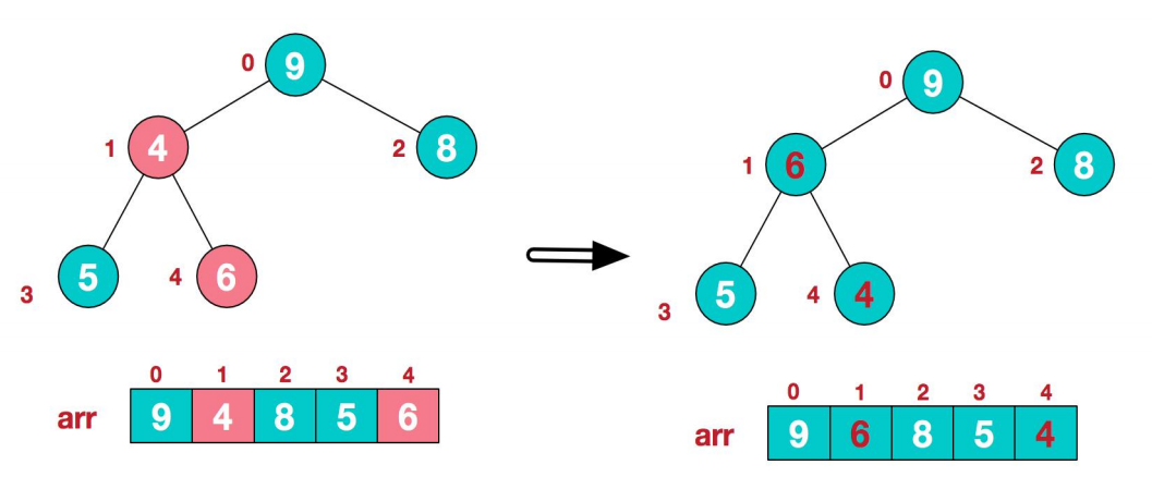 * 举例int arr[]={4, 6,8,5,9};=>i=1=> adjustHeap=>得到{4,9,8,5, 6}