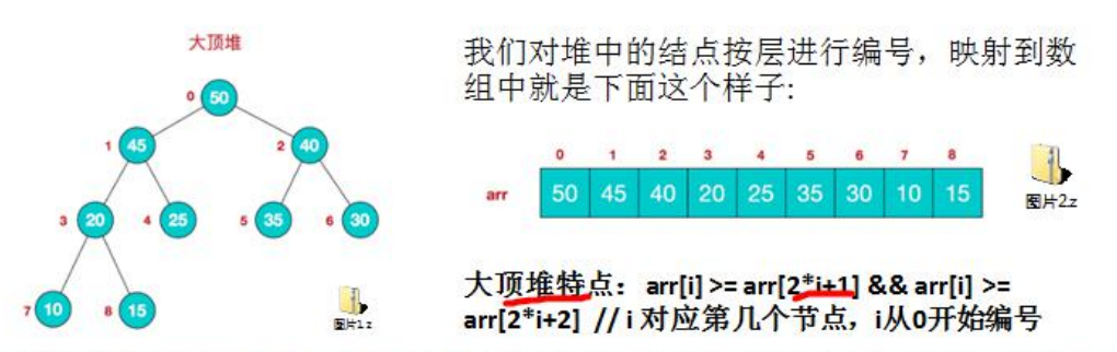2)堆是具有以下性质的完全二叉树:每个结点的值都大于或等于其左右孩子结点的值,称为大顶堆,注意:没有要求结点的左孩子的值和右孩子的值的大小关系。