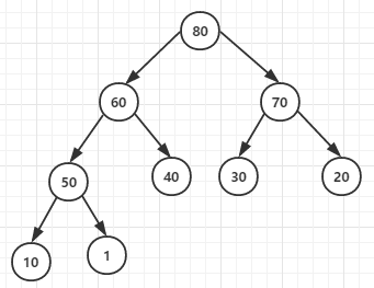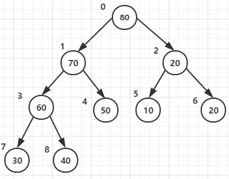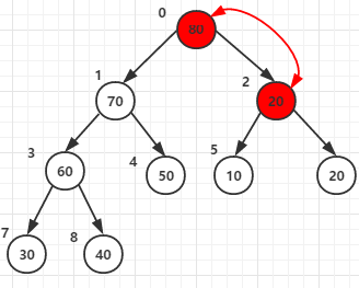 for循环将节点0和它的子节点1 2的元素进行比较,最大者为父节点(元素80作为父节点)