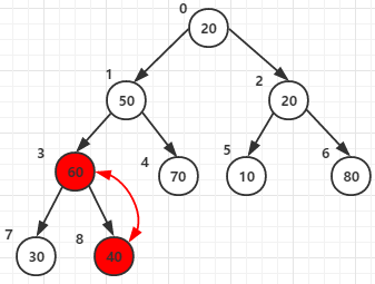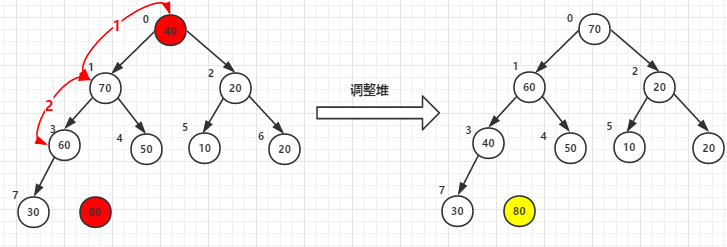 (1)堆顶元素80和尾40交换后-->调整堆