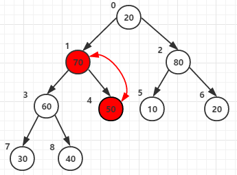 for循环将节点1和它的子节点3 4的元素进行比较,最大者为父节点(元素70作为父节点)