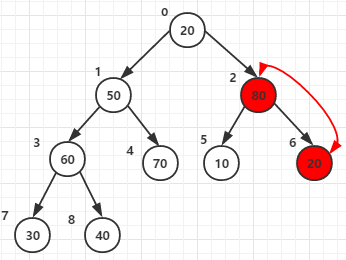 (注意这里,元素20和元素80交换后,20所在的节点还有子节点,所以还要再和它的子节点5 6的元素进行比较,