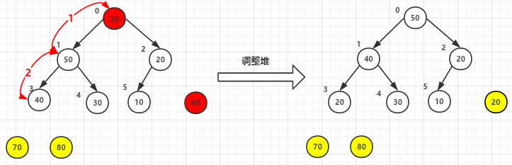 (3)堆顶元素60尾元素20交换后-->调整堆