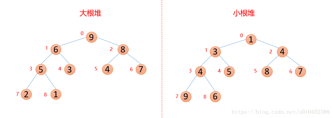 性质:每个结点的值都大于其左孩子和右孩子结点的值,称之为大根堆;每个结点的值都小于其左孩子和右孩子结点的值,称之为小根堆。如下图