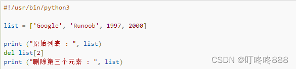 原始列表 : ['Google', 'Runoob', 1997, 2000] 删除第三个元素 : ['Google', 'Runoob', 2000]