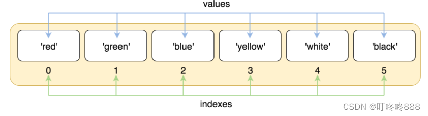 序列中的每个值都有对应的位置值,称之为索引,第一个索引是 0,第二个索引是 1,依此类推。