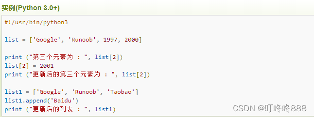 第三个元素为 : 1997 更新后的第三个元素为 : 2001 更新后的列表 : ['Google', 'Runoob', 'Taobao', 'Baidu']