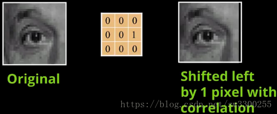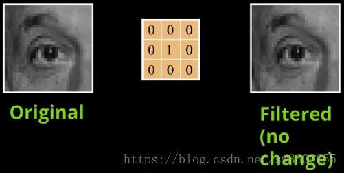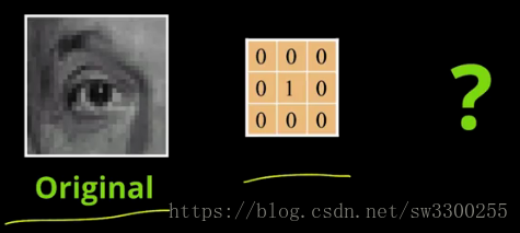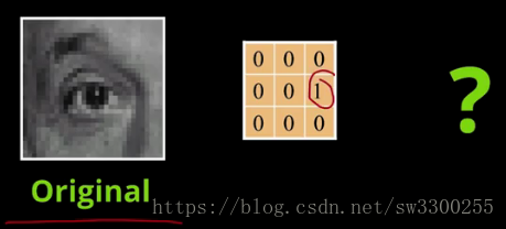 在这里我们有一张照片,左边是原始的照片,人的眼睛,我用脉冲过滤器卷积这个图像,你将会得到什么?