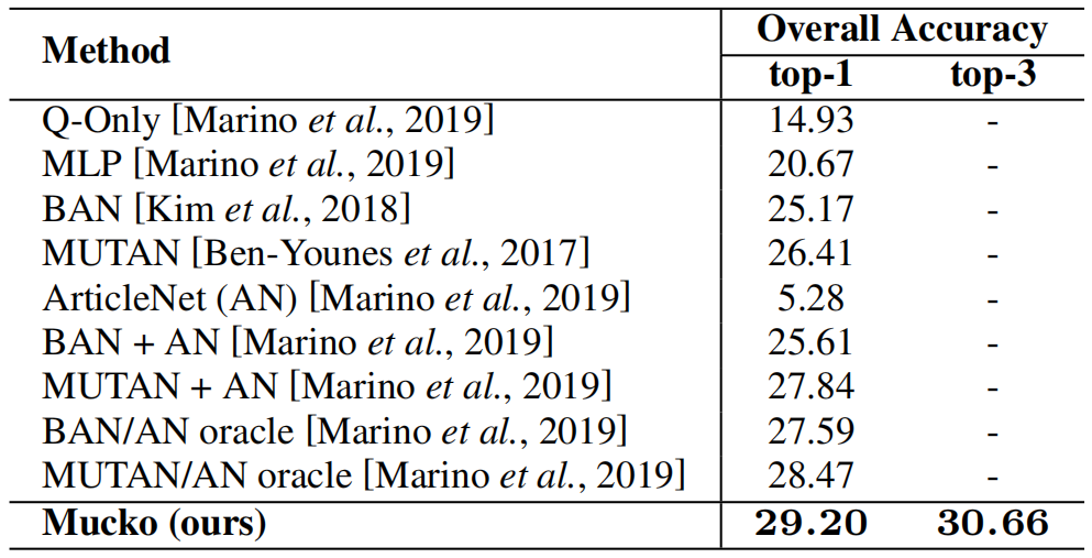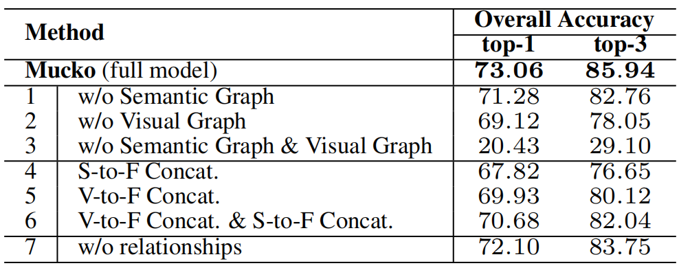 跨模态异构图推理由迭代的两部分(知识选择、跨模态知识推理)组成,共重复 T T T次。知识选择就是在每个图上,基于question分别对节点和边添加attention,然后使用图卷积进行节点更新。跨模态知识推理先基于事实图中的每个实体(entity)+question对视觉图和语义图的节点添加注意力,再基于此注意力计算出互补信息(计算过程就是注意力和节点特征的加权平均)。分别得到视觉图和语义图的互补信息后,使用一个门机制将它们和事实图的节点信息融合。最后,使用和知识选择部分一样的操作,对事实图中的信息进行Aggregation。 - 实验