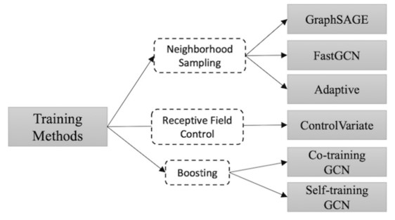 论文中还介绍了几种GNN的训练方法。比如Graph SAGE从节点的部分邻域聚合信息。Fast GCN采用样本采样方法替代节点的所有邻域信息。其宗旨都是为了改进图模型计算复杂这一缺点,这些训练方法,都使得模型的训练效率更加的高效
