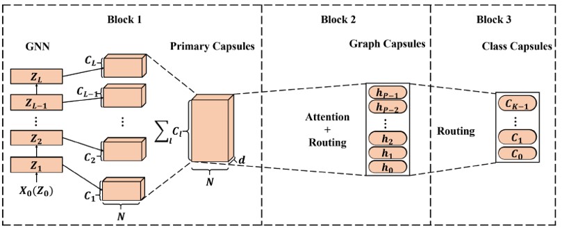 - Block2:高级图胶囊提取模块,融合了注意力模块和动态路由,以生成多个图胶囊