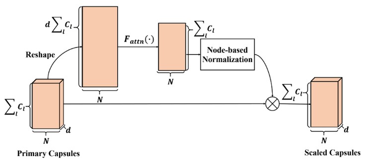将初始胶囊的每一个节点的所有通道的d维向量进行concat,生成第二个图的向量,利用注意力函数F计算出注意力值矩阵,然后对每一行进行归一化,得到每个通道不同节点的注意力值的归一化值,然后与原来初始胶囊相乘,可以得到>带有不同注意力的胶囊向量组