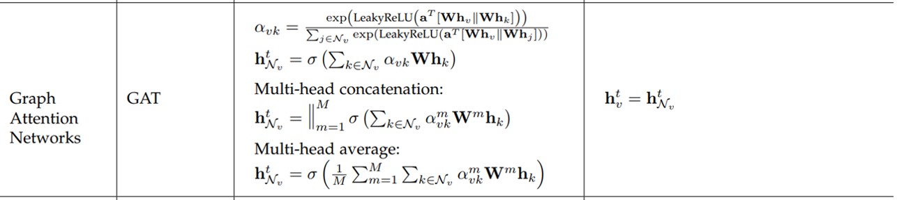 - 在模型中,信息的传播步骤和输出步骤是获得节点或者边隐含状态的关键步骤。不同变种的GNN的聚合函数(用来聚合图中所有点的邻域信息,产生一个全局性的输出)和节点状态更新函数如下图所示,其中常见的就是卷积聚合函数和